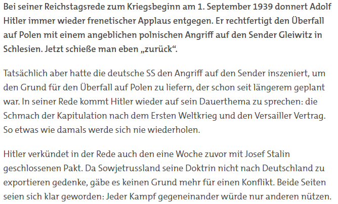 Seit Monaten leiden wir alle unter der Qual eines Problems, das uns auch der Versailler Vertrag, d.h. das Versailler Diktat, einst beschert hat, eines Problems, das in seiner Ausartung und Entartung für uns unerträglich geworden war. Danzig war und ist eine deutsche Stadt. Der Korridor war und ist deutsch. Alle diese Gebiete verdanken ihre kulturelle Erschließung ausschließlich dem deutschen Volke. Ohne das deutsche Volk würde in all diesen östlichen Gebieten tiefste Barbarei herrschen.