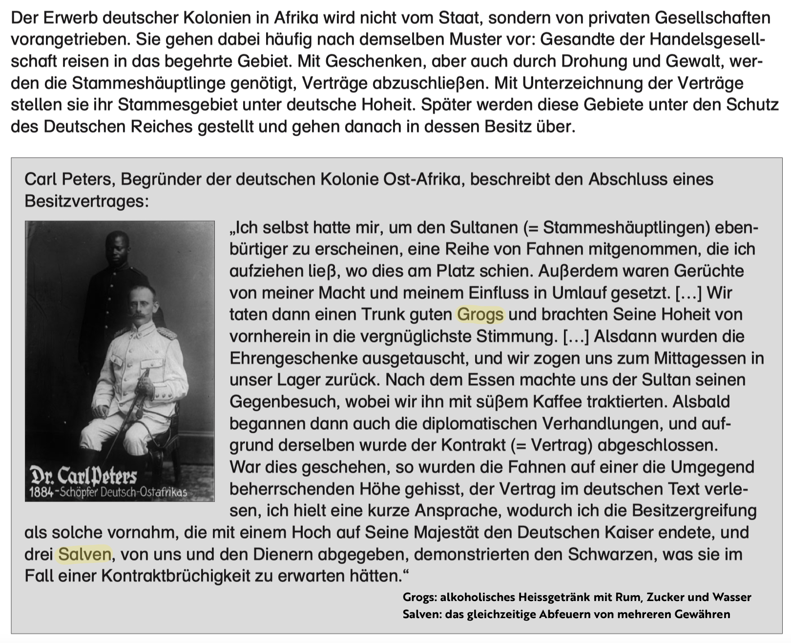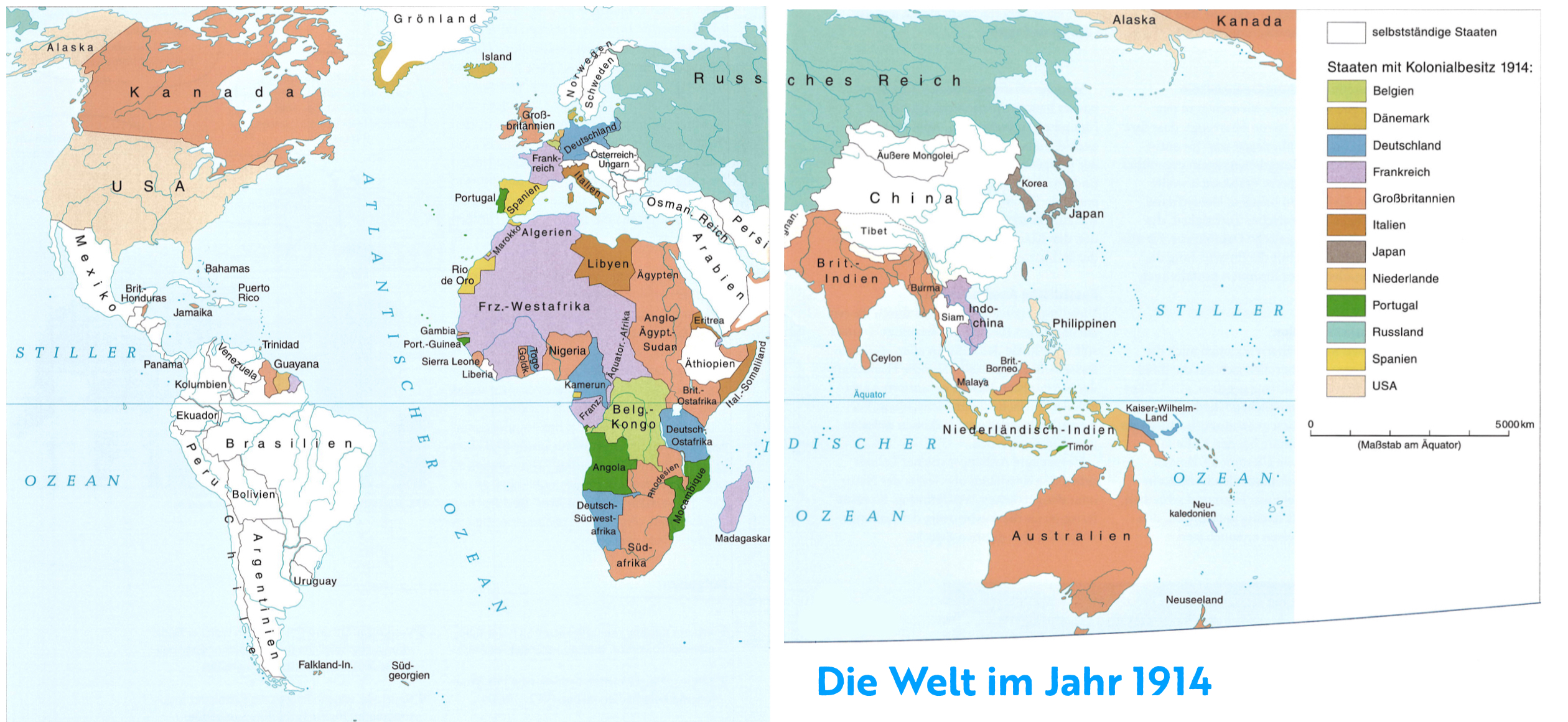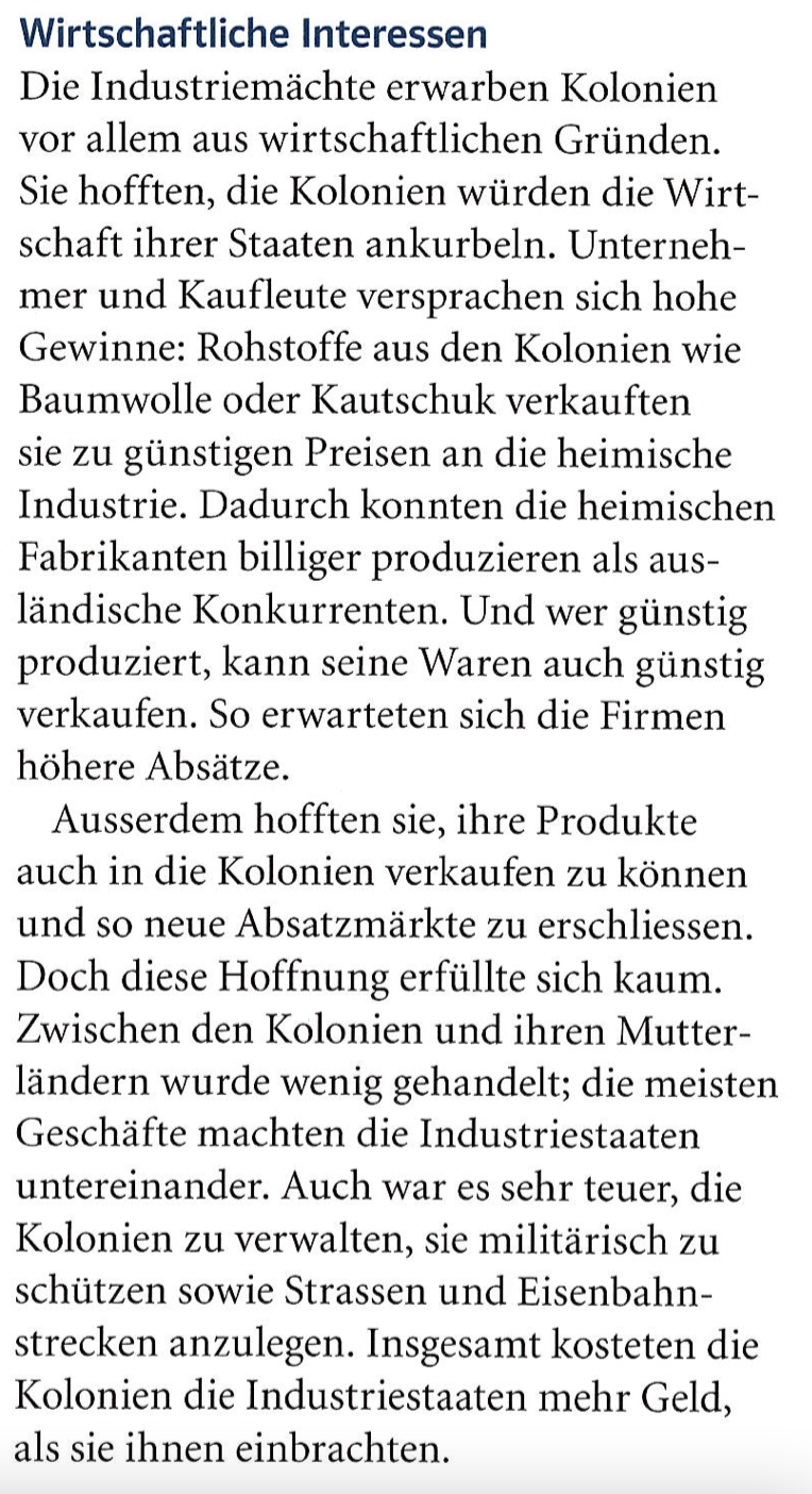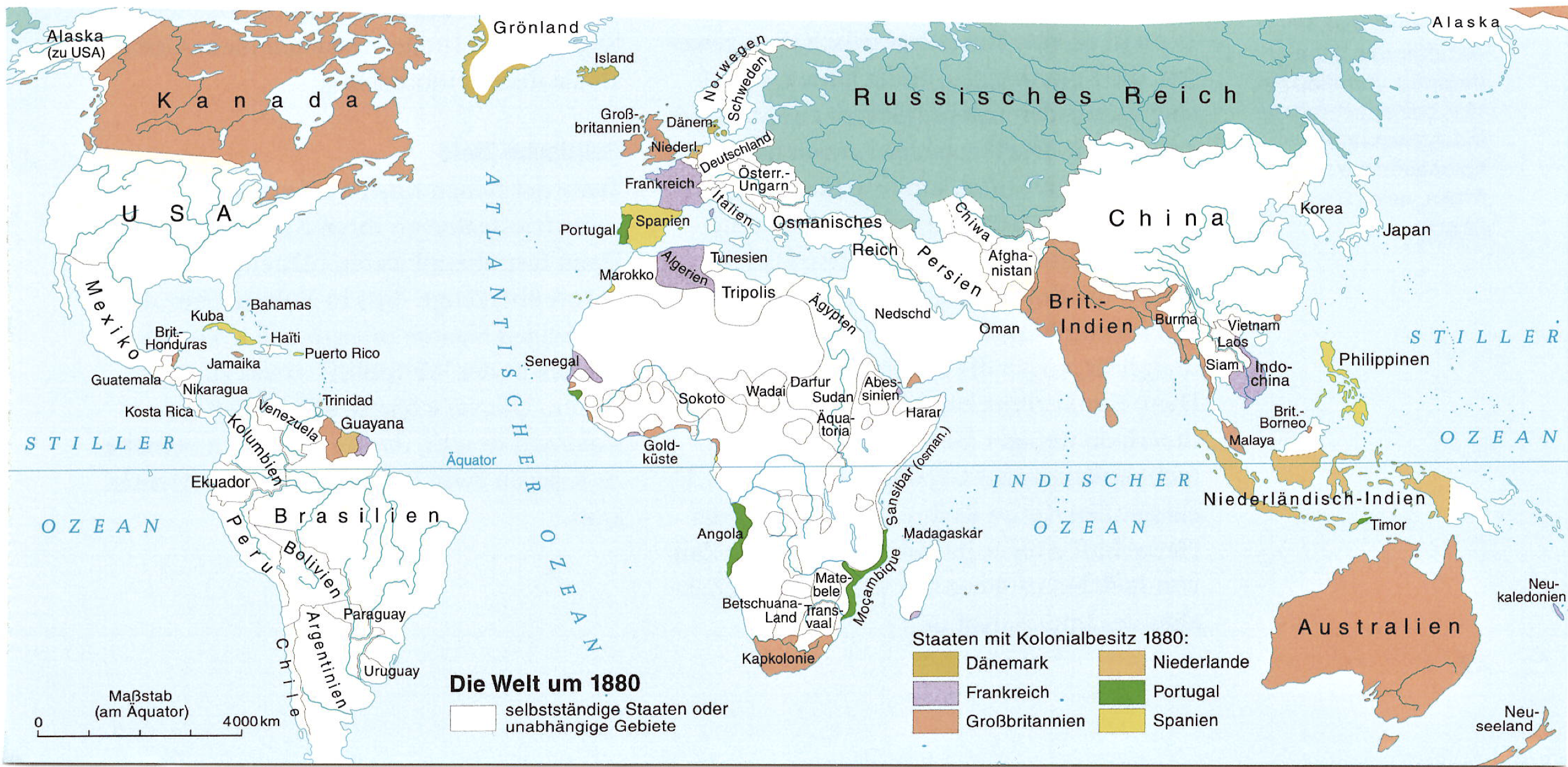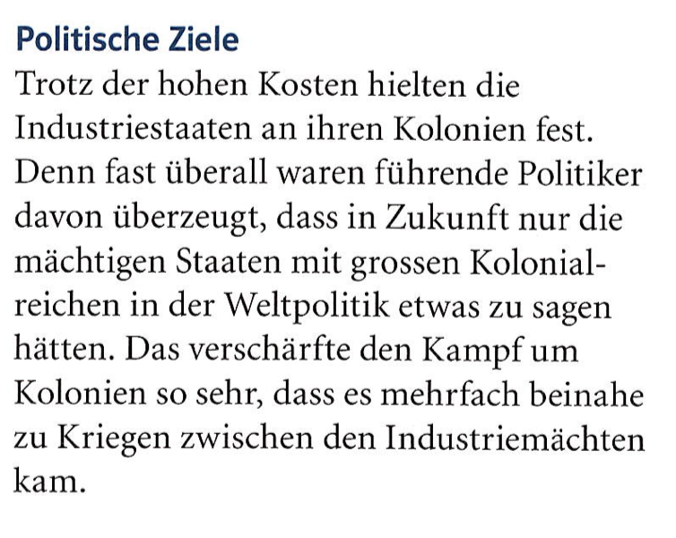 Schon seit mehr als 300 Jahren hatten Europäer Kolonien in vielen Teilen der Erde erworben. Aber zwischen 1880 und 1914 entwickelte sich daraus ein Wettkampf um Kolonien, wie es ihn bis dahin noch nicht gegeben hatte. Mit Deutschland, den USA und Japan waren neue mächtige Industriestaaten entstanden die nun auch nach Kolonien verlangten. So wollten sie ihr Herrschaftsbereich vergrössern. Aus den Kolonien konnten Rohstoffe erworben werden und Fertigprodukte verkauft werden.