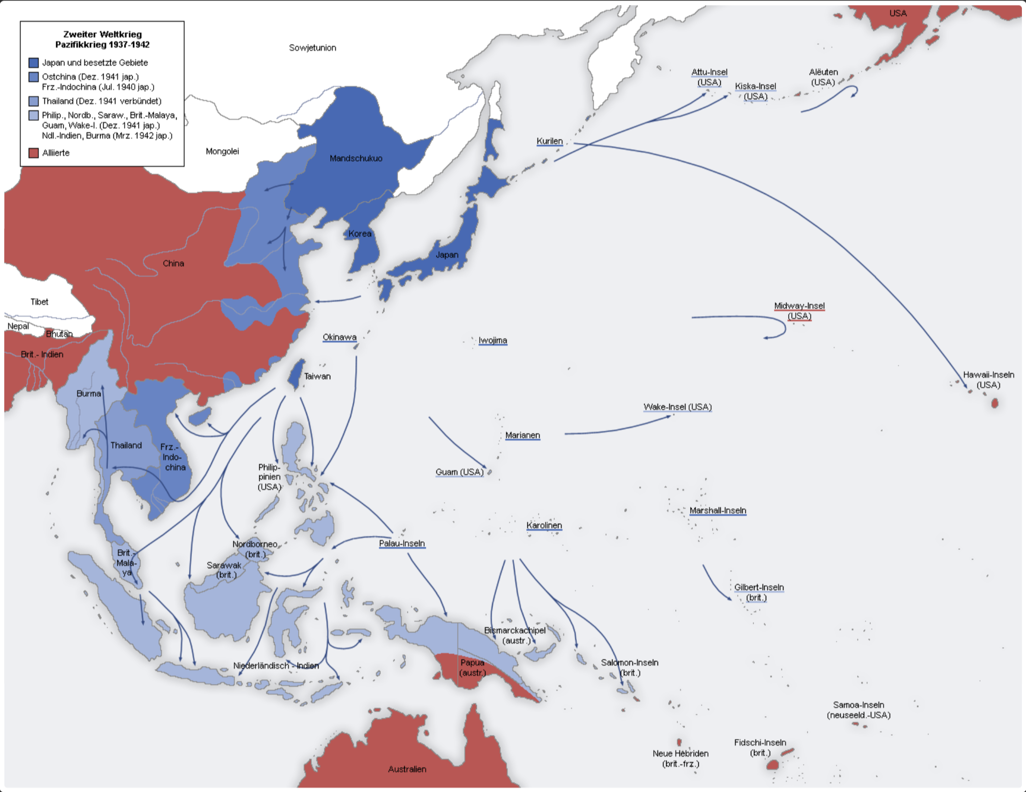 Japan verfolgte seit 1930 unter der Herrschaft des Kaisers Hirohito eine sehr aggressive Aussenpolitik. Die Japaner verehrten ihren Kaiser wie eine Gottheit und folgten ihm in den Kampf. In den Jahren 1931/32 bestzten japanische Truppen die Mandschurei, einen Teil von China. 1937 drangen die Japaner in China weiter vor, brannten Häuser nieder und töteten die Einwohner, unter ihnen auch tausende Frauen und Kinder. Später besetzte Japan weitere Teile Asiens wie Indochina.