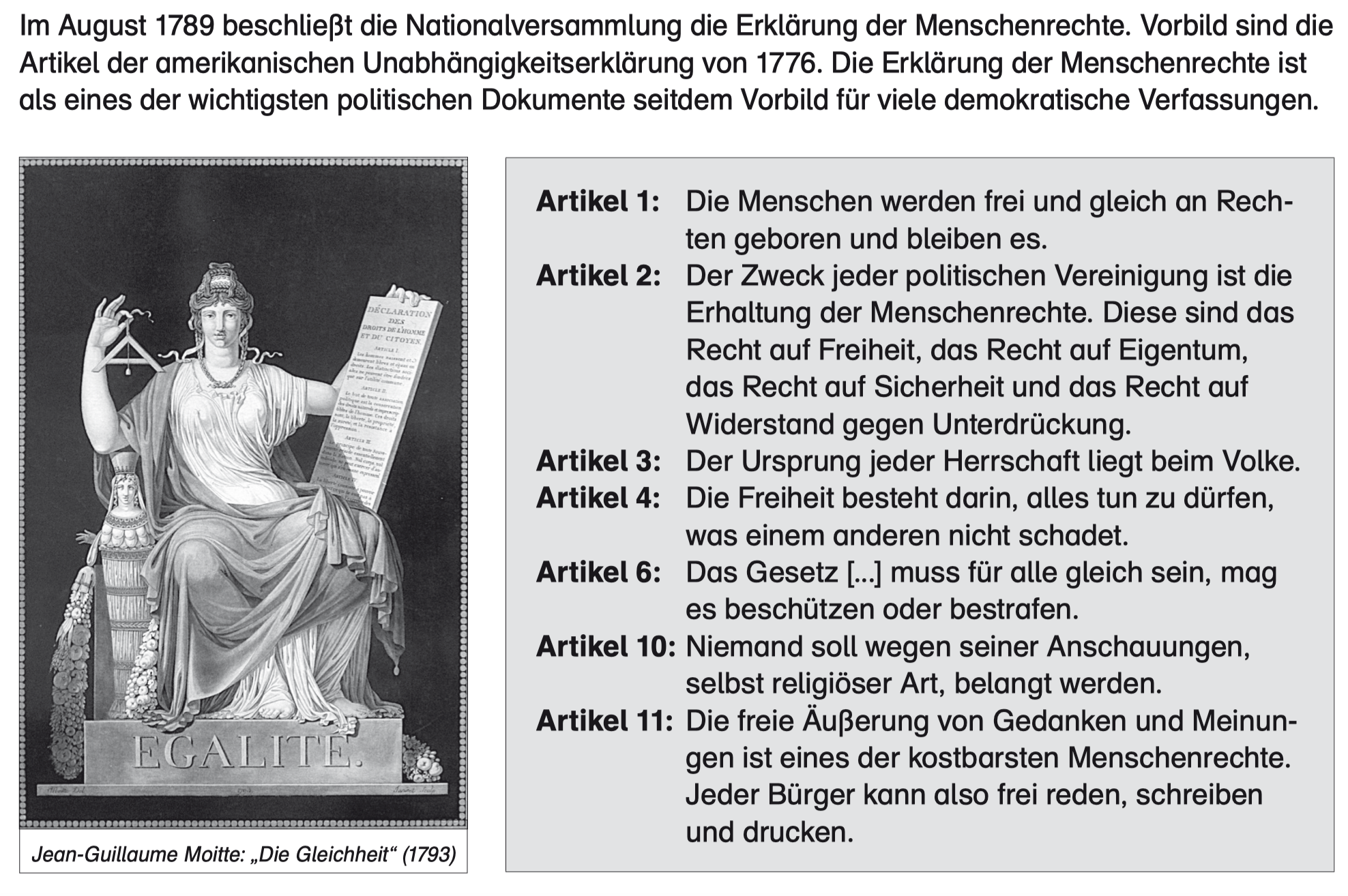 Im Juni 1791 wird die neue Verfassung Frankreichs fertiggestellt. Frankreich wird zu einer konstitutionellen (= verfassungsgemässen) Monarchie. Der König bleibt zwar Staatsoberhaupt, hat aber weniger Rechte und kann nicht mehr allein regieren. Er wird durch die Verfassung kontrolliert. Die Macht im Staate wird aufgeteilt. Die Nationalversammlung verfasst als gesetzgebende Gewalt (= Legislative) die Gesetze. Der König, seine Minister und die Beamten sind für die Ausführung der Gesetze (= Exekutive) verantwortlich. Unabhängige Richter (= Judikative) sorgen für eine gerechte Rechtsprechung.